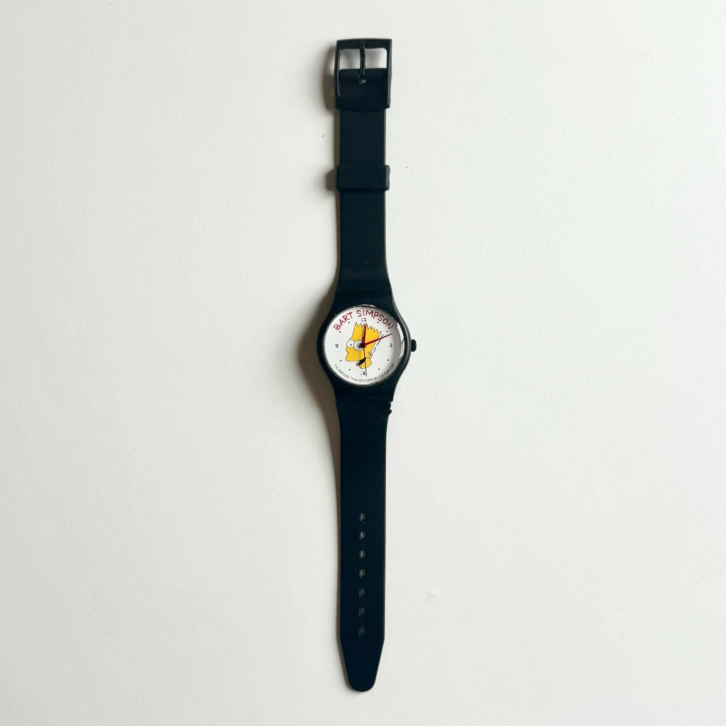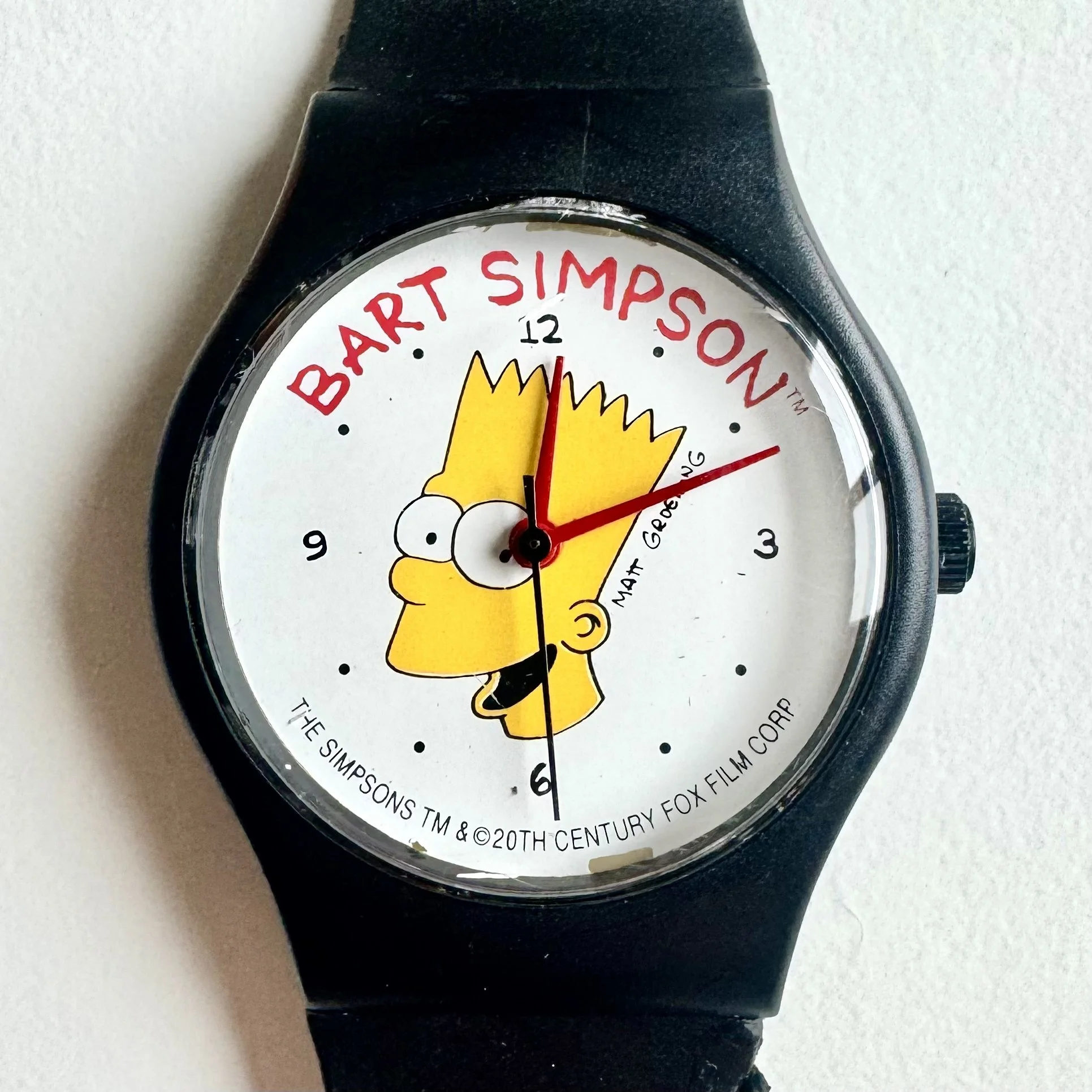 Very odd bootleg Simpsons artifact, winding mechanical 35mm plastic strap and case watch. Strap is removable, but it is in decent shape for its age. Gen X artifact.
