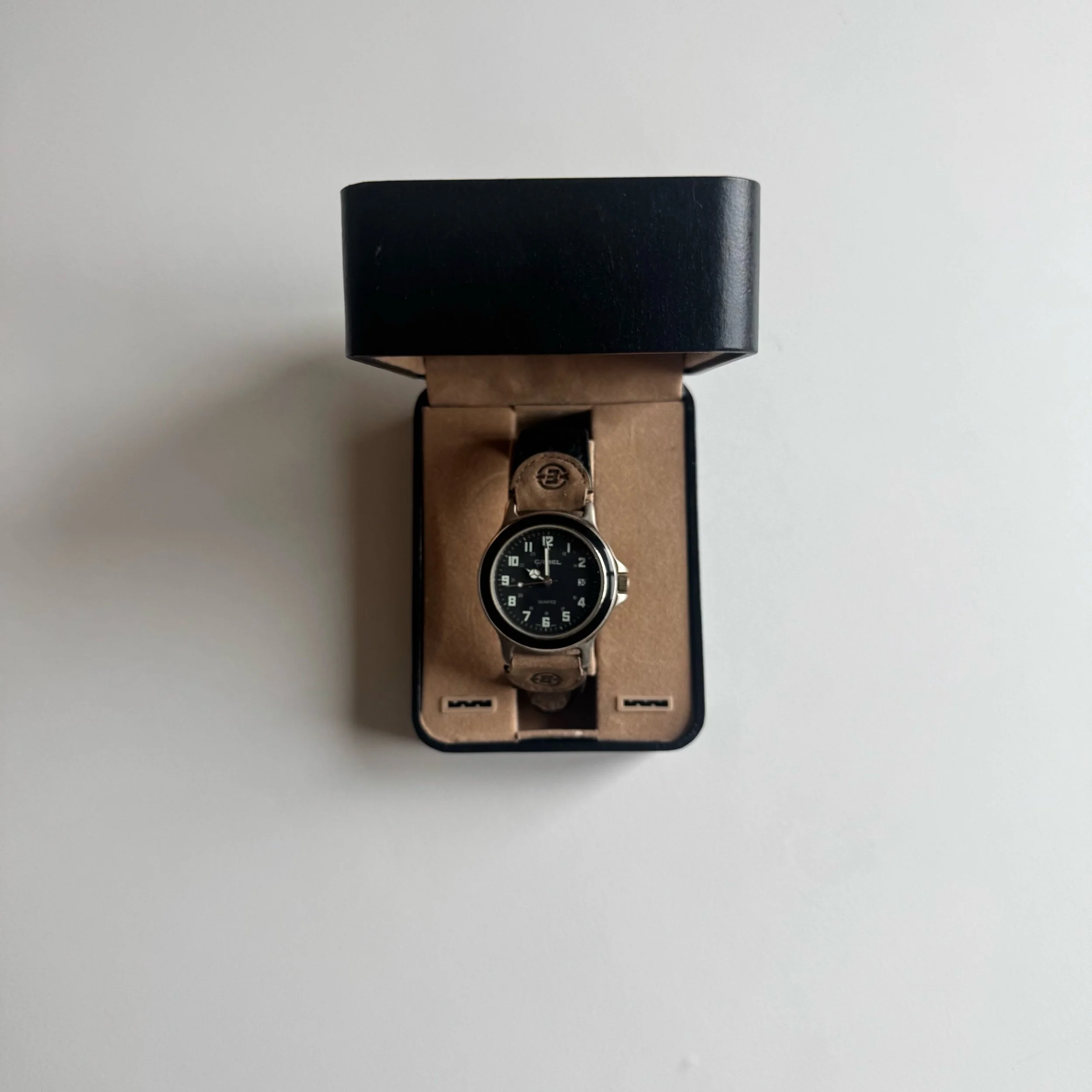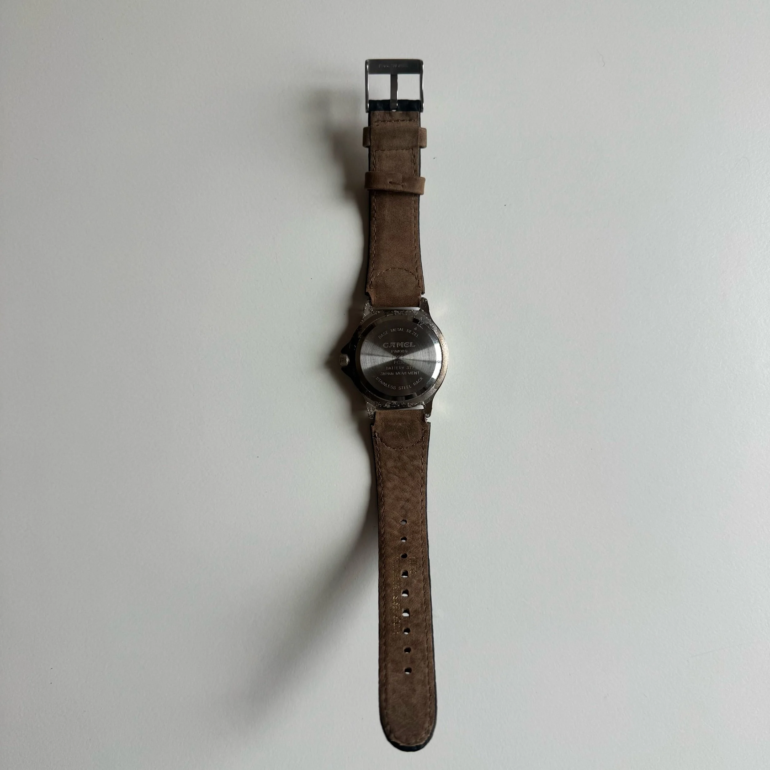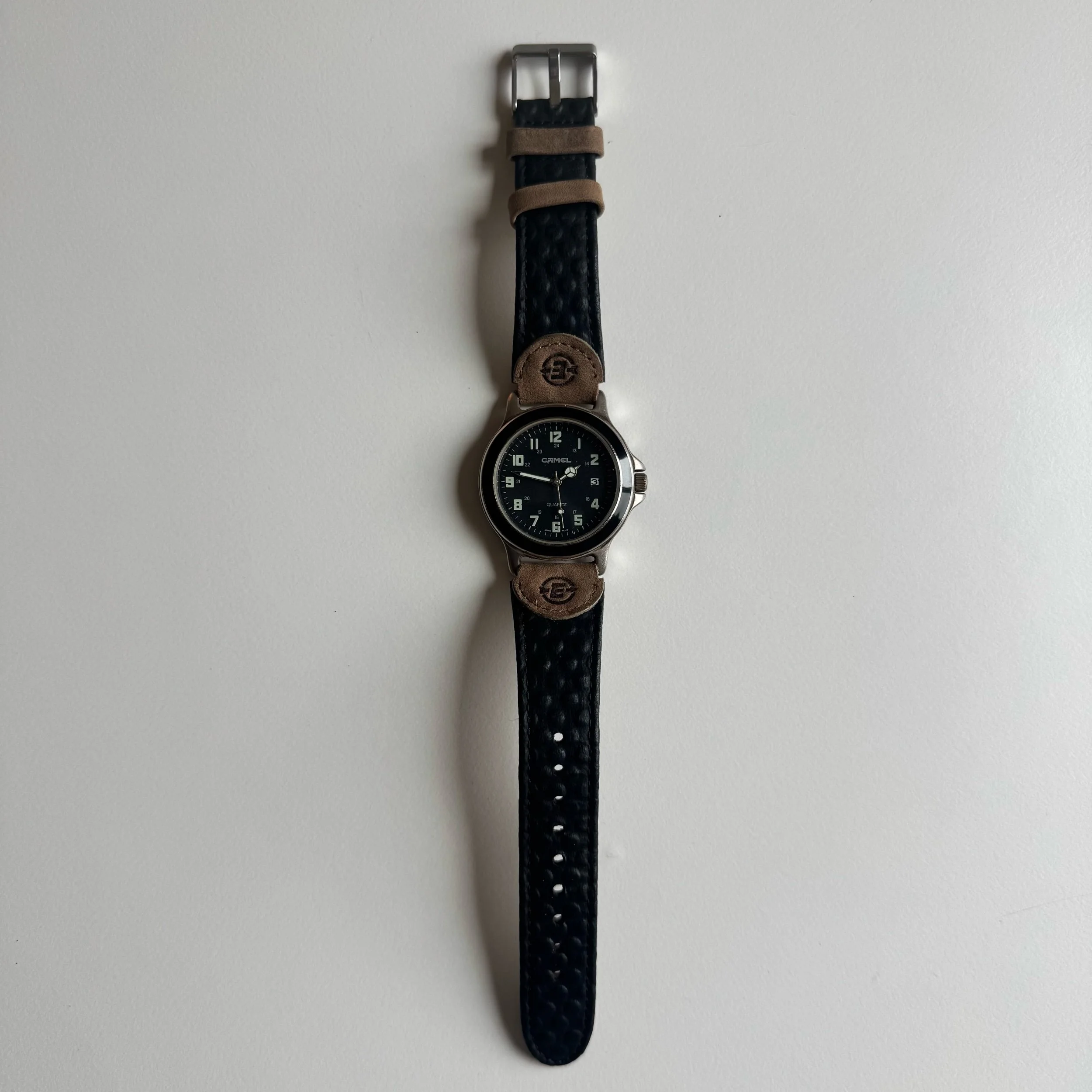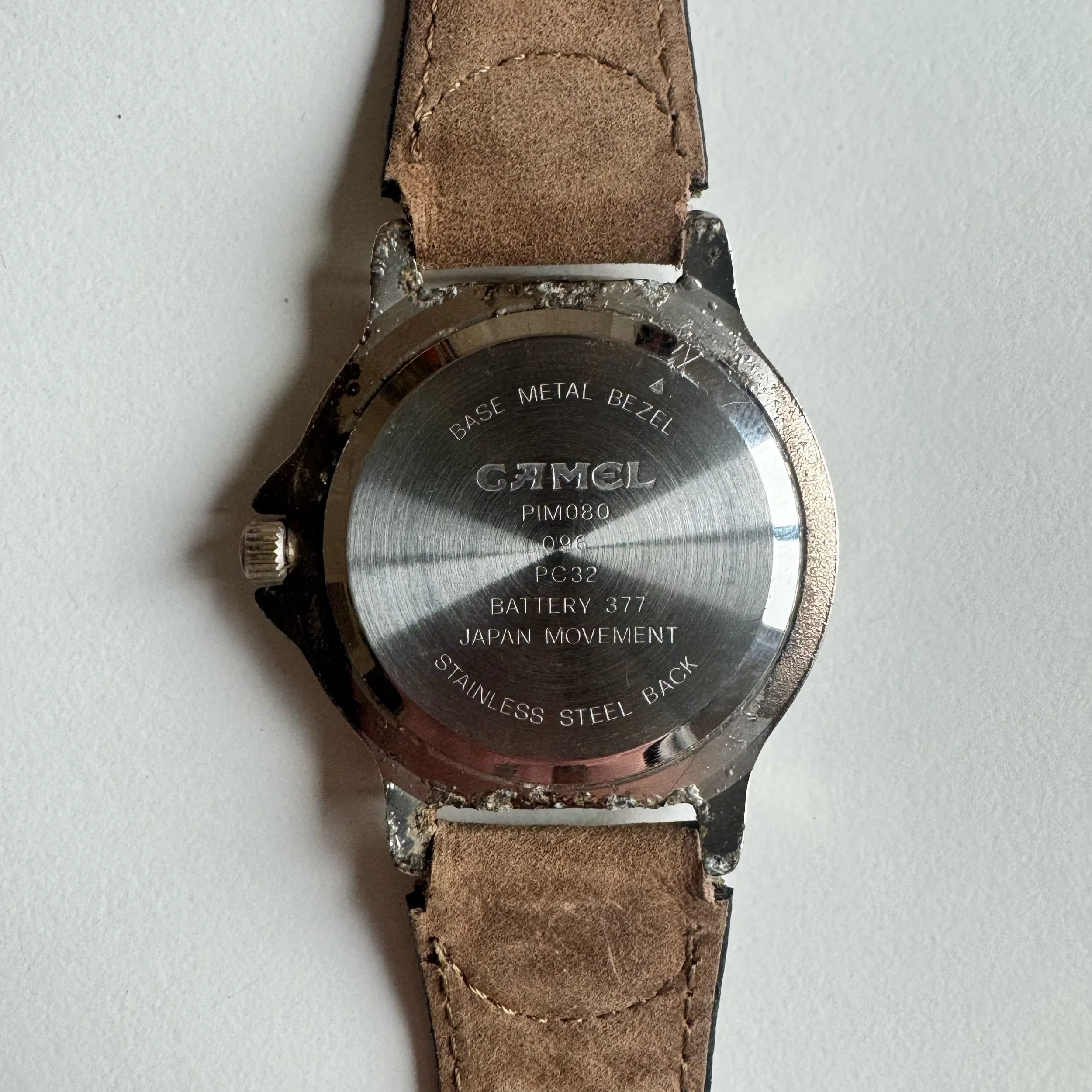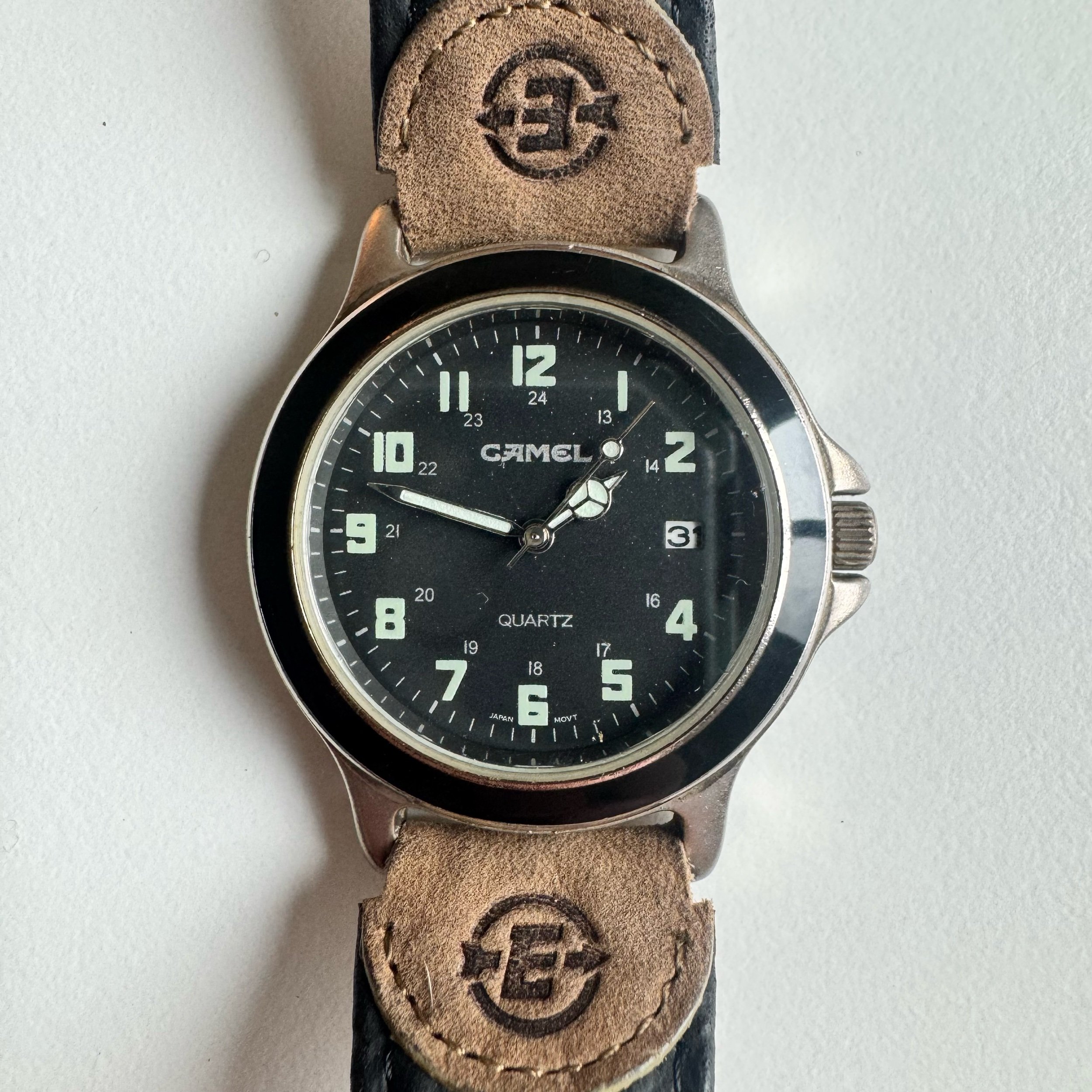 36 mm case, Camel-branded field watch. Box and papers included, in fair condition, back is corroded but not a structural problem. Possibly a Timex Expedition, or meant to emulate a certain 1990s model of it. Box and papers (just the manual) included.