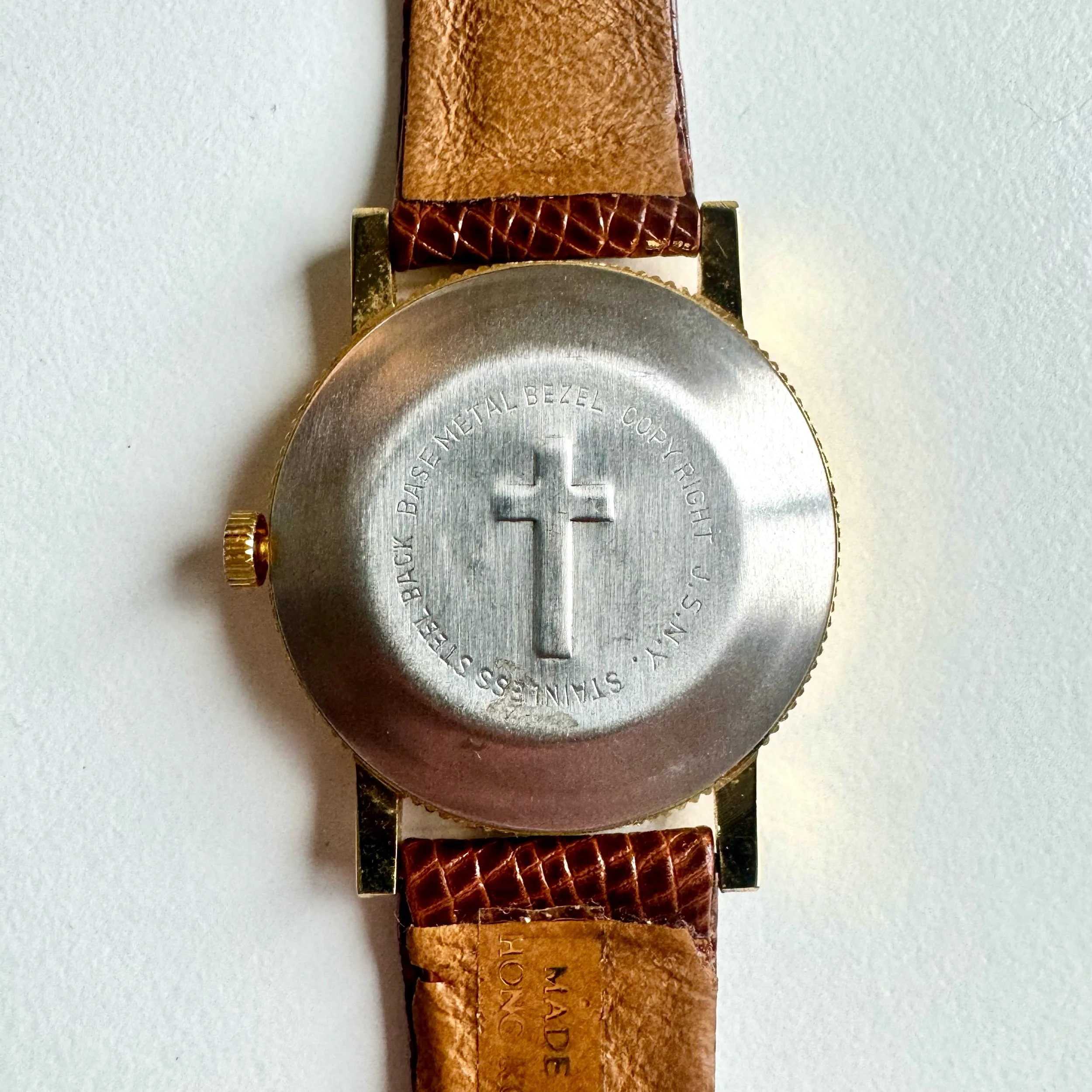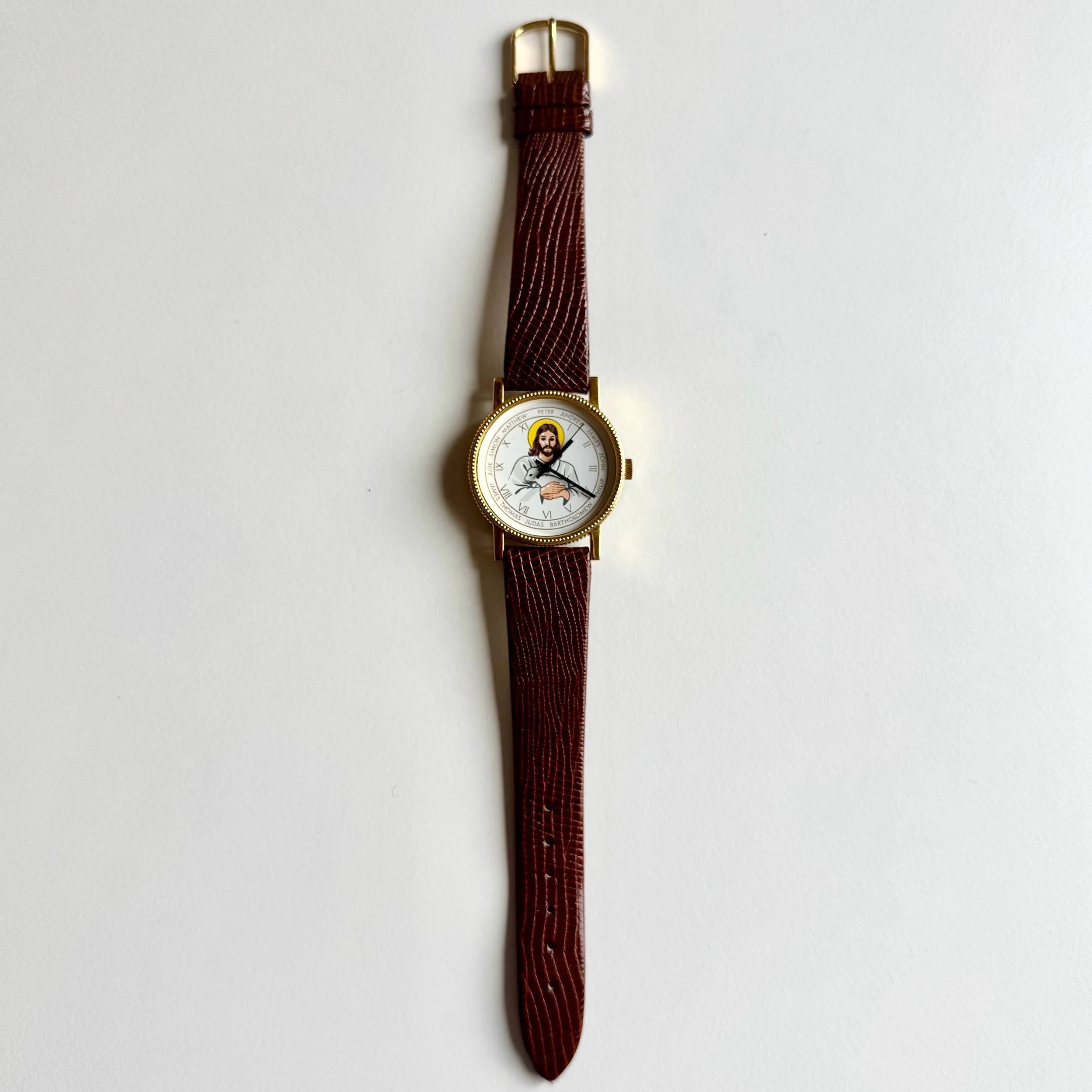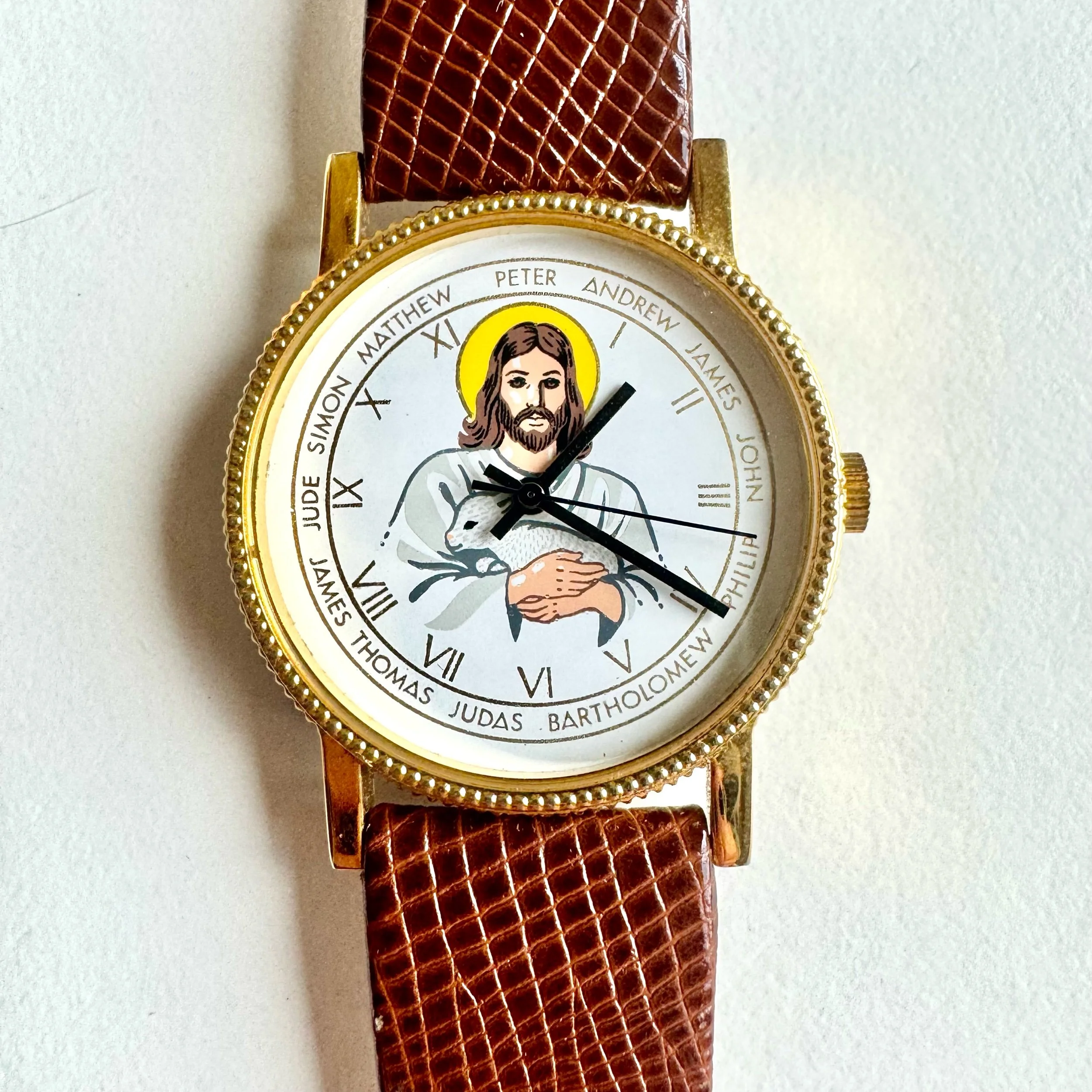 Jesus holding lamb on white dial with apostles named at each hour, cross on case back. Hobnail style bezel, winding mechanical movement, 37mm case. An extremely strange watch of unclear origin; great condition, possibly made recently, Jesus has oddly dark eyes.
