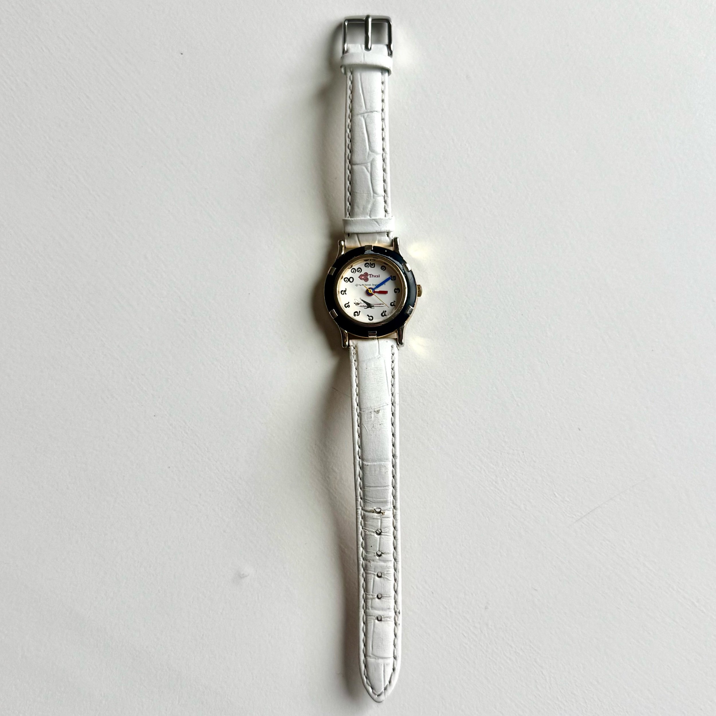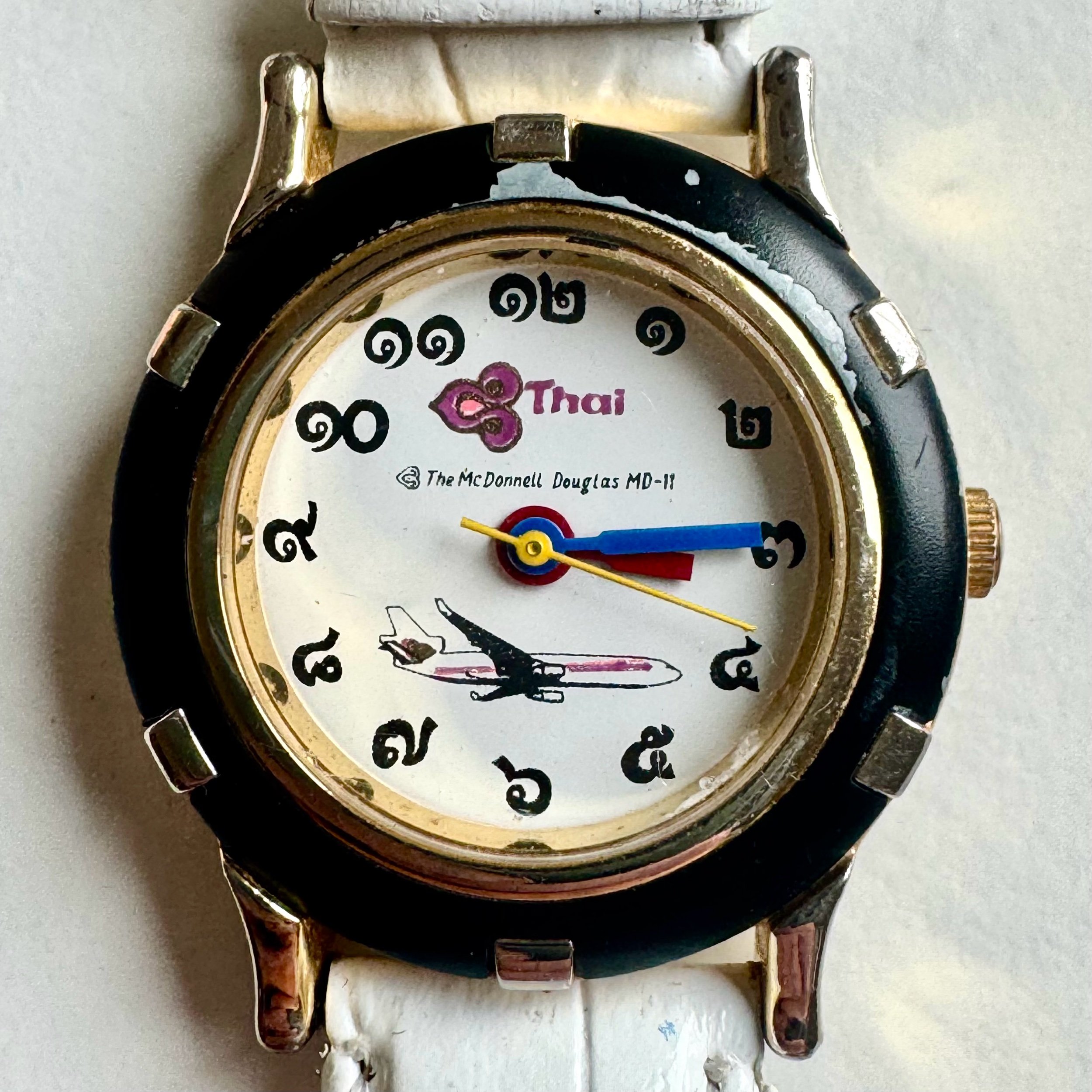 25 mm ladies’ quartz watch from Thai Airlines. Thai numerals, multicolor hands, and company logo with plane illustrated on dial. Slight damage to bezel, otherwise great condition. Very chic and heady ladies’ watch.