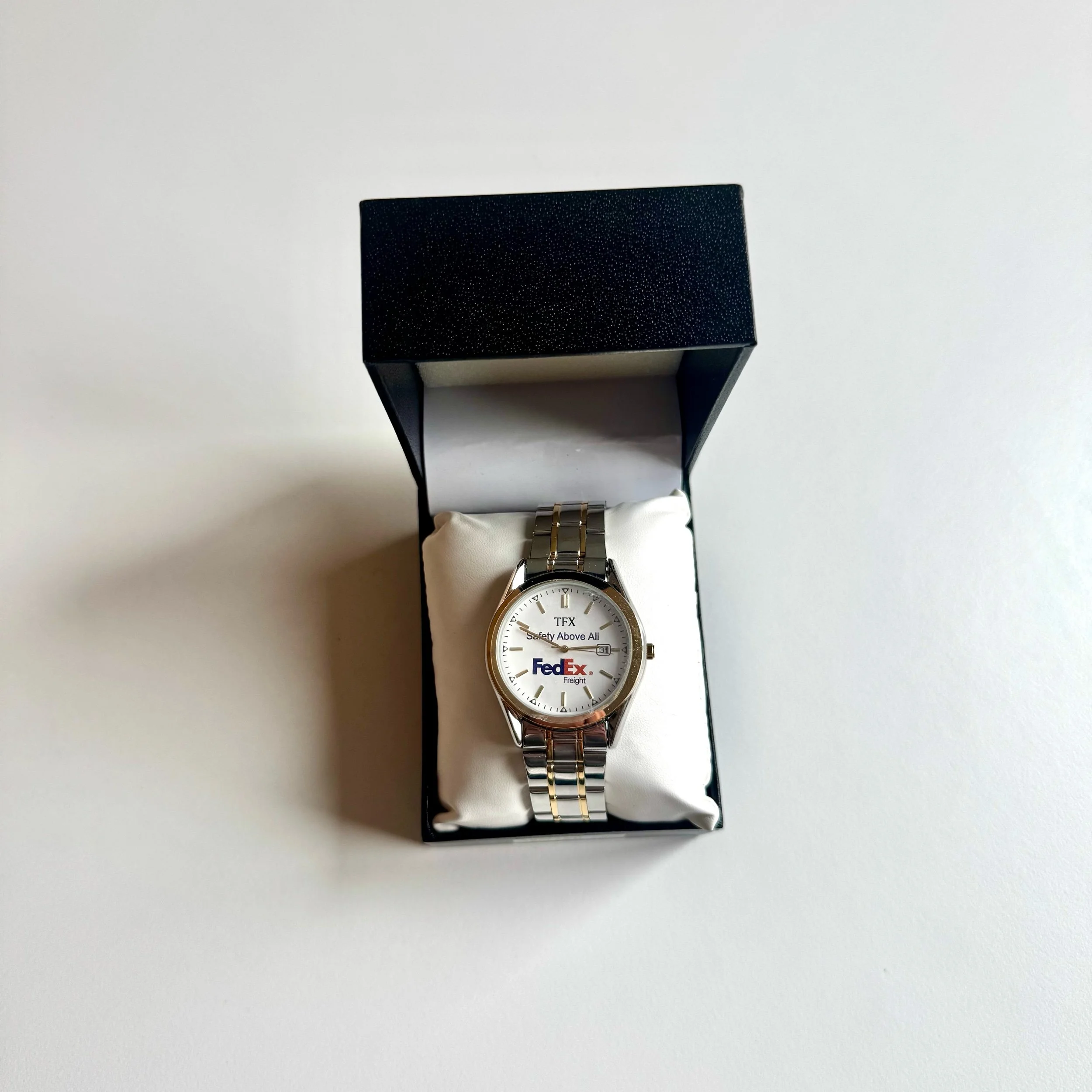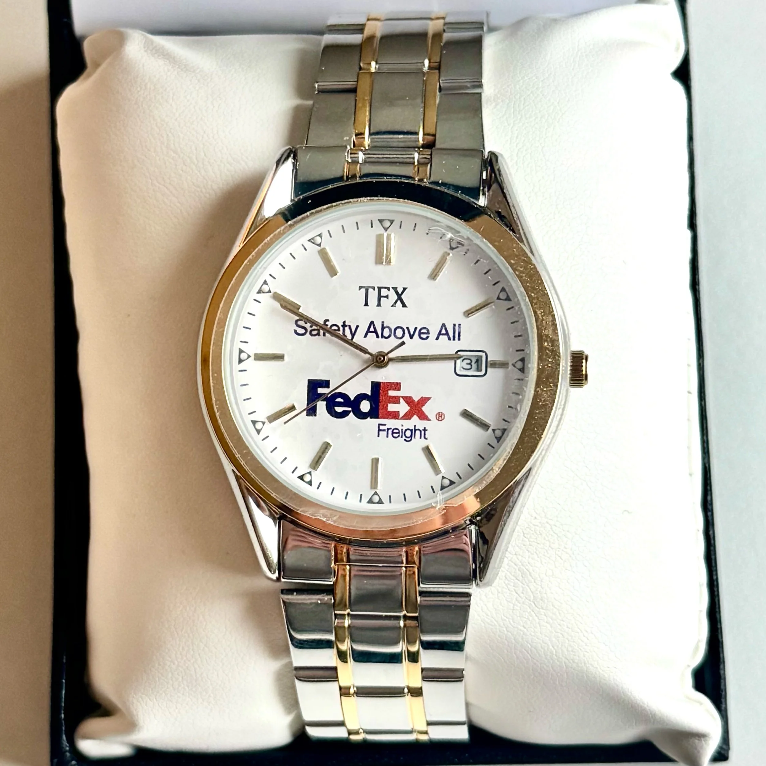 TFX (Bulova diffusion) for a safe driver working for Fedex Freight, with logo on dial. Bracelet around 8”, adjustable (links can be removed + microadjuster on clasp), about 38mm case. Comes with box and papers.